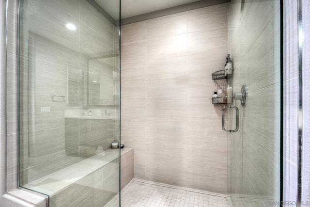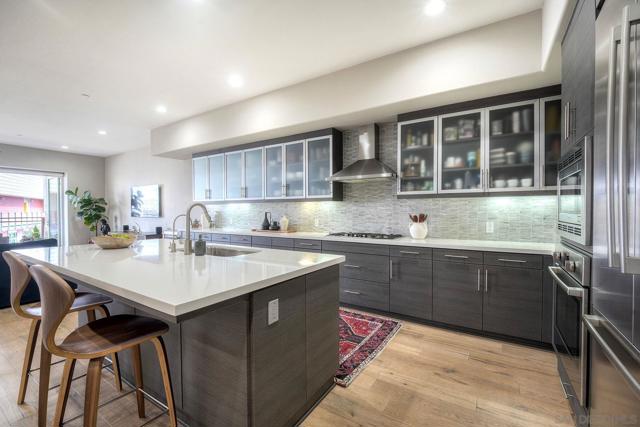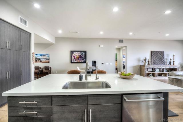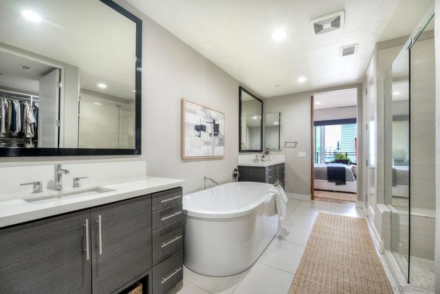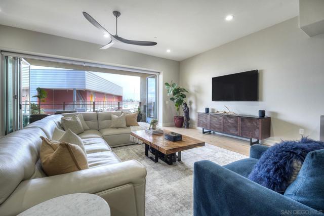 Welcome to Waterpoint, one of Point Loma's most coveted waterfront communities. This exquisite single-level residence offers an expansive 2,214 sq. ft. of refined coastal living space with sweeping views of the downtown SD skyline and bay. Designed for effortless luxury, this home features 10 ft ceilings, 3 full baths, 2 expansive primary-style suites plus a versatile office/den which can easily be converted into a 3rd bedroom. The chef's kitchen showcases European-style cabinetry, Bosch appliances, a wine fridge & generous prep space ideal for entertaining on a grand scale. The open living area flows seamlessly through LaCantina stacking doors to a private outdoor patio complete with a cozy fireplace - the perfect setting to enjoy coastal breezes & the glittering skyline. The primary suite features a spa-inspired bathroom offering a spacious walk-in shower and a floating soaking tub. The dreamy walk-in closet complete with built-ins has plenty of space for all of your luxury items, and you don't want to miss the sliding glass doors leading to your second private patio - perfect for your morning coffee. Thoughtful items and upgrades to note; hardwood flooring throughout, LED recessed lighting fixtures throughout, modern barn doors on primary bathroom and office/den space creating privacy, motorized blackout shades in the primary bedroom, gas stub out on patio for your BBQ, & pull out shelves throughout the kitchen. Waterpoint is conveniently located directly behind numerous waterfront paths leading to restaurants, coffee shops, and multiple docks for our boat lovers. You are also just a few minutes away from the SD Yacht Club, Liberty Station and the SD Airport.