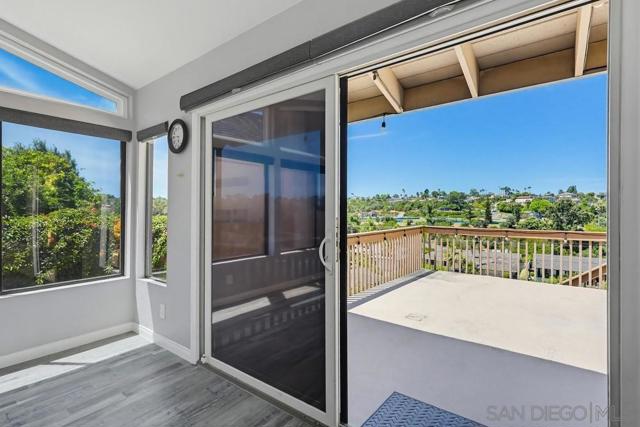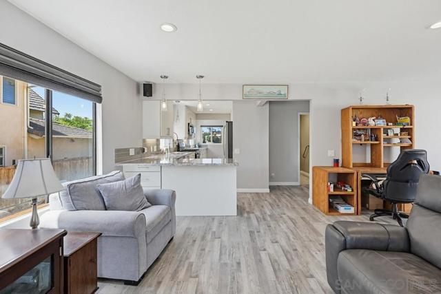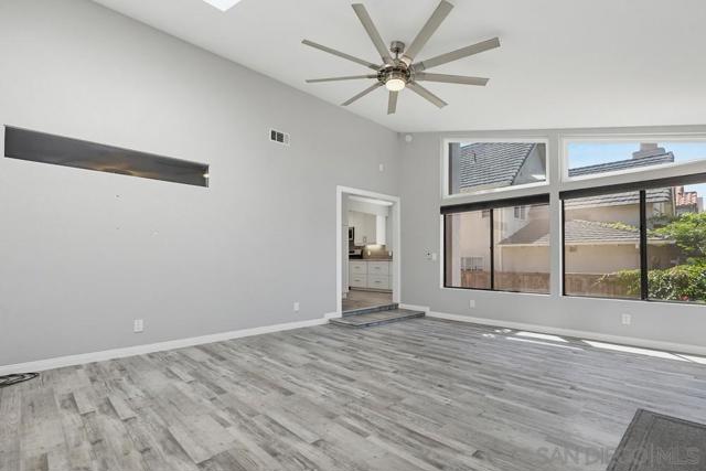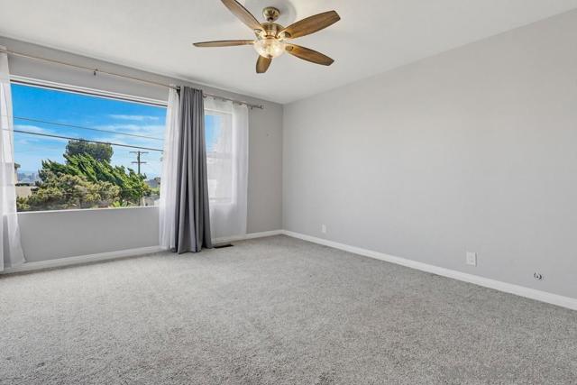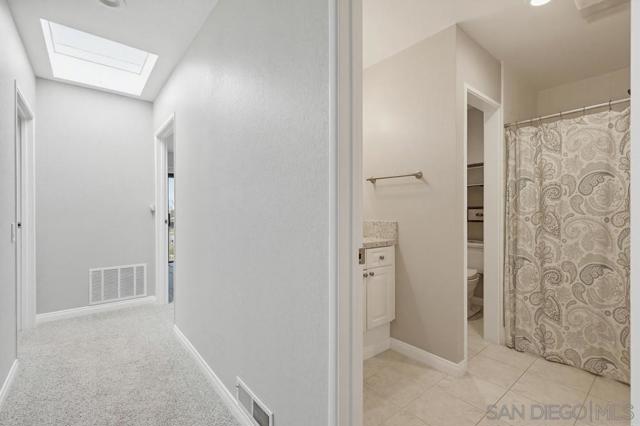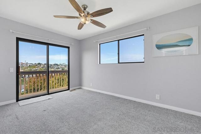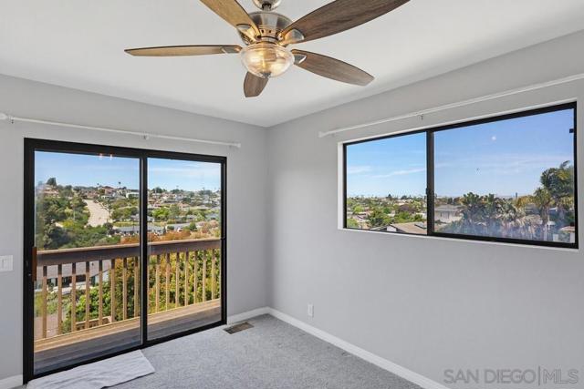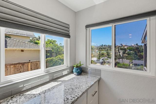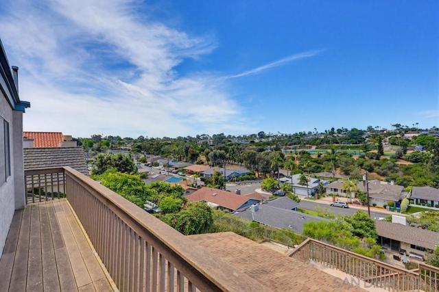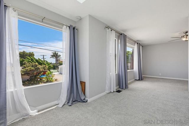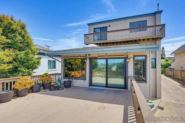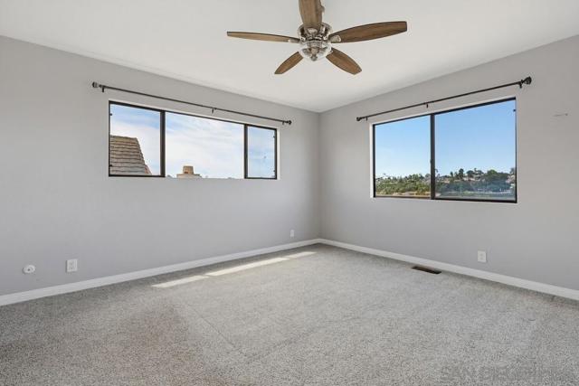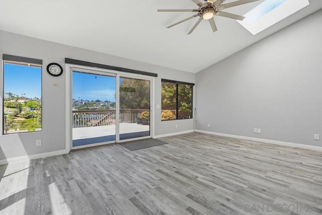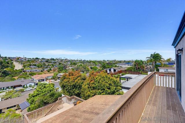 Perched atop a prime hilltop, this expansive 3,166 sq. ft. residence offers a rare dual-aspect perspective: serene canyon vistas to the west and sparkling glimpses of the San Diego Bay and downtown skyline to the east. This thoughtfully designed 4-bedroom, 3-bathroom home perfectly blends spacious living with functional elegance. The versatile floor plan features two primary suites—one conveniently located on the main level and a second upstairs alongside two additional guest rooms. The heart of the home is a light-filled kitchen equipped with stainless steel appliances, classic white cabinetry, and brushed nickel hardware. It transitions seamlessly into the adjacent family room, where soaring cathedral ceilings, a bright skylight, and sliding glass doors lead to a private back deck—an ideal setup for indoor-outdoor entertaining. Two private retreats featuring plush carpeting and walk-in closets. The main ensuite offers a spa-like experience with a tiled shower and separate soaking tub. Well-appointed upstairs bedrooms with walk-in closets and a shared hallway bath featuring double sinks and a private shower/commode room. An oversized hallway skylight floods the upper level with natural light, enhancing the home's airy atmosphere. A dedicated laundry room and a functional family hub located directly off the kitchen for effortless daily living. Experience the perfect balance of elevation, coastal breezes, and tranquility in this exceptional hilltop home.