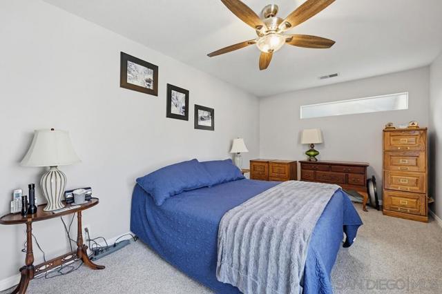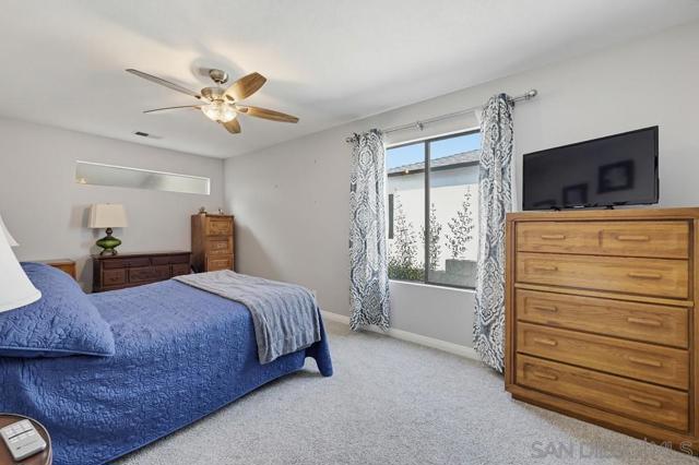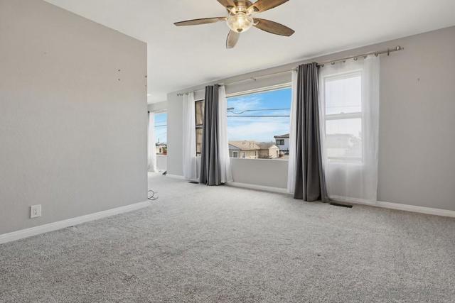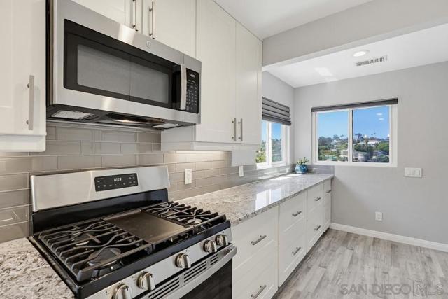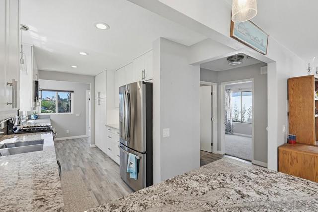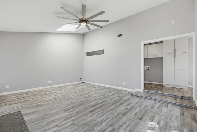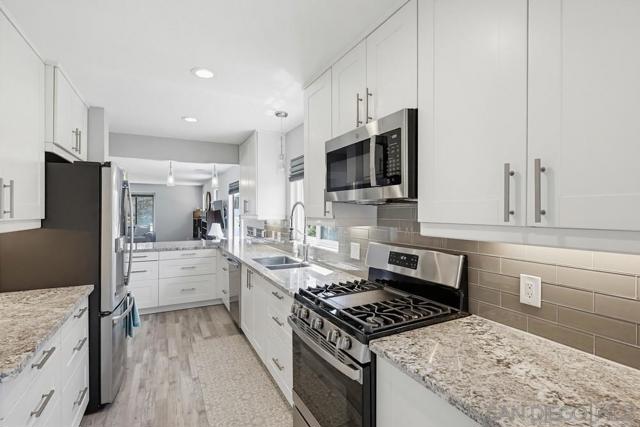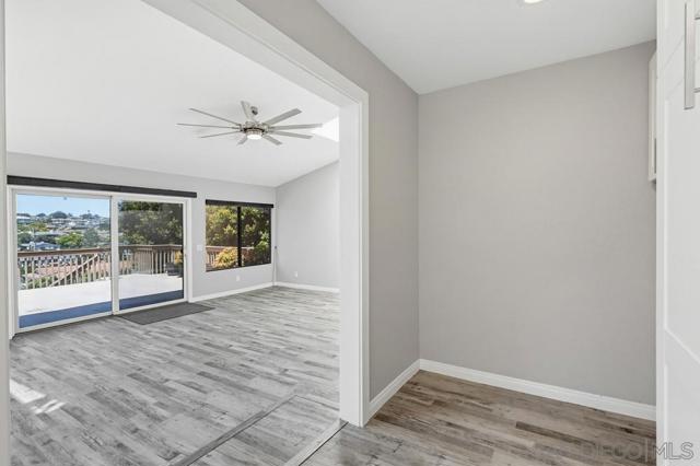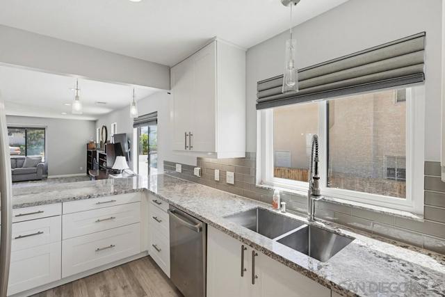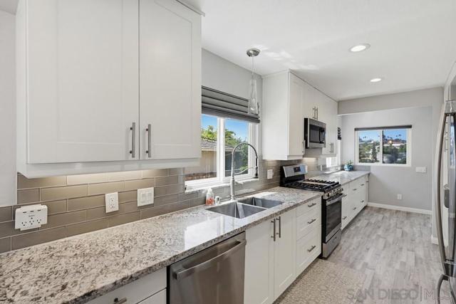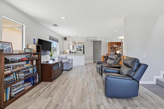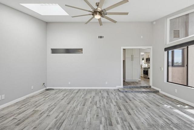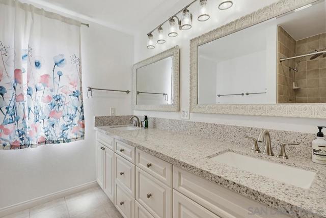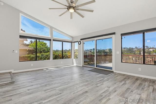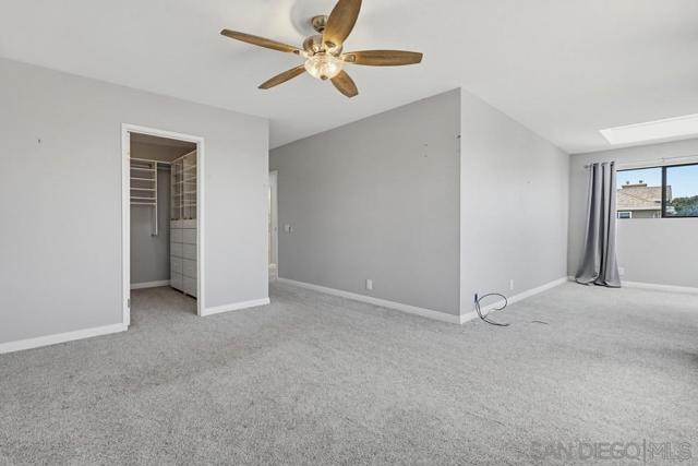 Perched atop a prime hilltop, this expansive 3,166 sq. ft. residence offers a rare dual-aspect perspective: serene canyon vistas to the west and sparkling glimpses of the San Diego Bay and downtown skyline to the east. This thoughtfully designed 4-bedroom, 3-bathroom home perfectly blends spacious living with functional elegance. The versatile floor plan features two primary suites—one conveniently located on the main level and a second upstairs alongside two additional guest rooms. The heart of the home is a light-filled kitchen equipped with stainless steel appliances, classic white cabinetry, and brushed nickel hardware. It transitions seamlessly into the adjacent family room, where soaring cathedral ceilings, a bright skylight, and sliding glass doors lead to a private back deck—an ideal setup for indoor-outdoor entertaining. Two private retreats featuring plush carpeting and walk-in closets. The main ensuite offers a spa-like experience with a tiled shower and separate soaking tub. Well-appointed upstairs bedrooms with walk-in closets and a shared hallway bath featuring double sinks and a private shower/commode room. An oversized hallway skylight floods the upper level with natural light, enhancing the home's airy atmosphere. A dedicated laundry room and a functional family hub located directly off the kitchen for effortless daily living. Experience the perfect balance of elevation, coastal breezes, and tranquility in this exceptional hilltop home.